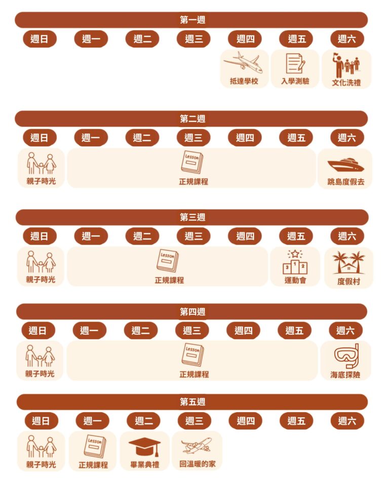 週一 / 週二 / 週四 / 週五:籃球、羽毛球、桌遊、舞蹈等週三:游泳課