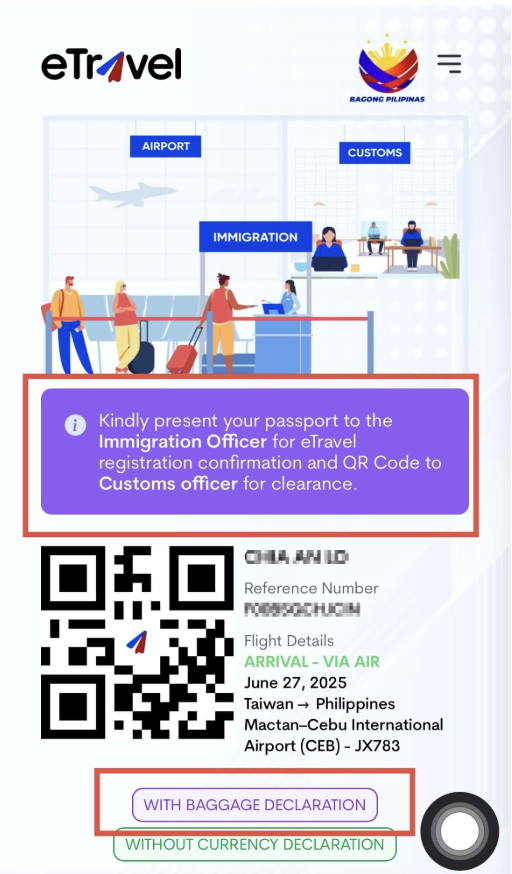 只需要在飛機起飛前 5 天內線上註冊並申請菲律賓 eTravel ,並將最後完成畫面的QR code 截圖或列印提供備查。